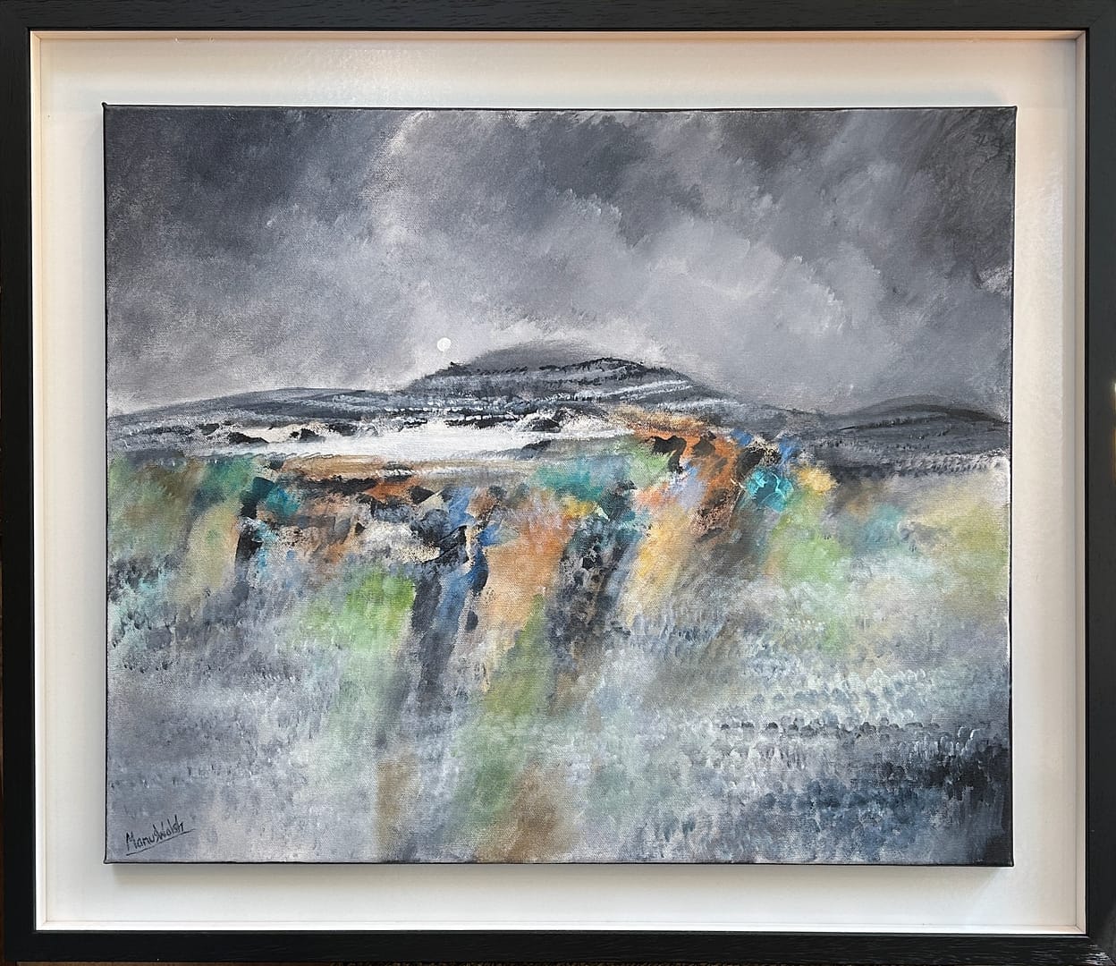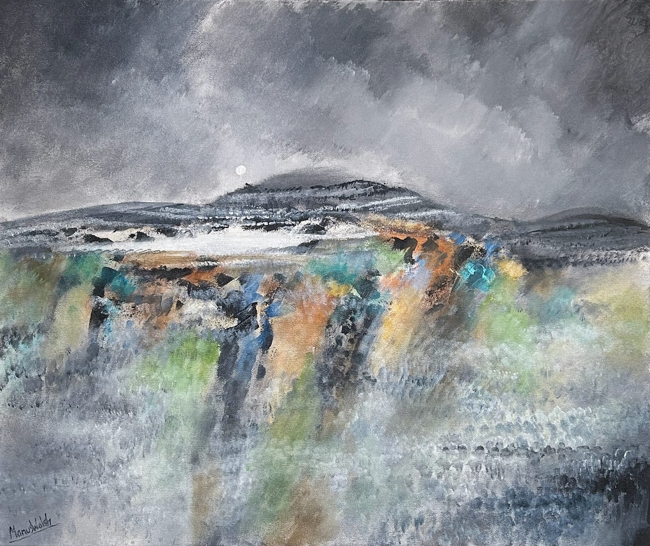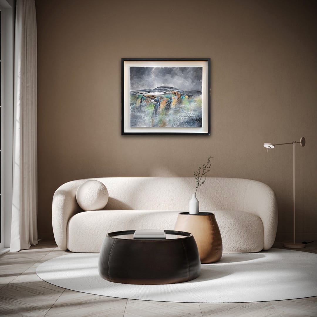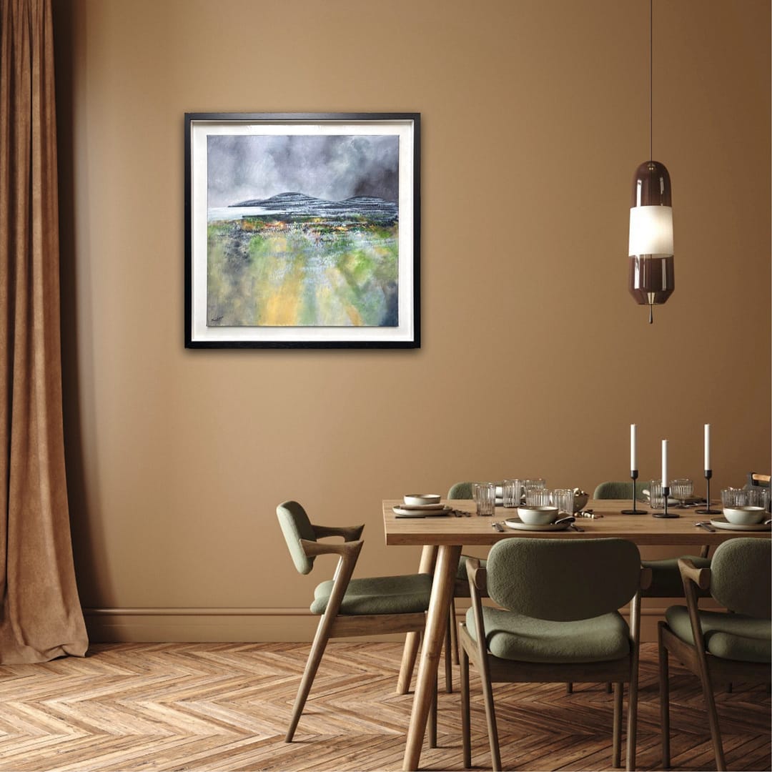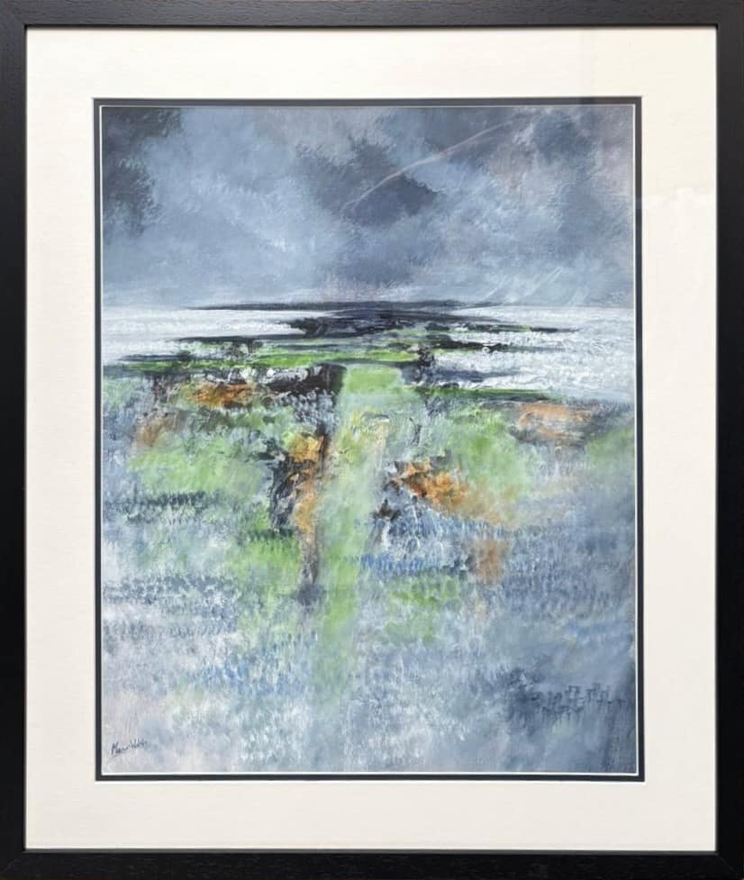 For over 28 years he has been living in the unique Burren area in the West of Ireland, an area that has greatly influenced his work. His exploration of this area has produced a wonderful series of stratified landscapes, all horizontal lines, full of ghosts, still, calm, including some remarkable nocturnal views. Over the last 15 years, his travels to Spain, Cuba, Chile, France, Germany and Italy have brought an infusion of colour and rhythm to his work; seen in the graceful shapes and strong outlines of Picassoesque musicians, the hustle and bustle of Valparaiso, or the noonday heat of a Spanish village.